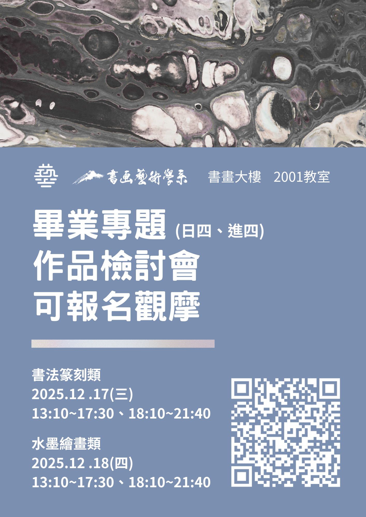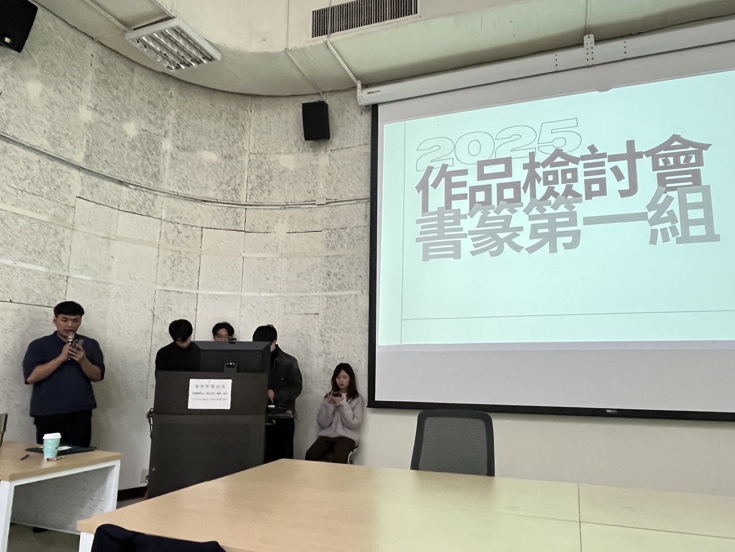 本系於 12 月 17 日及 18 日順利辦理四年級作品檢討會,分別就書法、篆刻與水墨繪畫類別進行專業檢討與交流。本次活動由日間學士班與進修學士班學生共同參與,採分組簡報方式進行,學生彙整近年創作成果,透過簡報說明創作理念與實踐歷程,展現階段性學習成效。