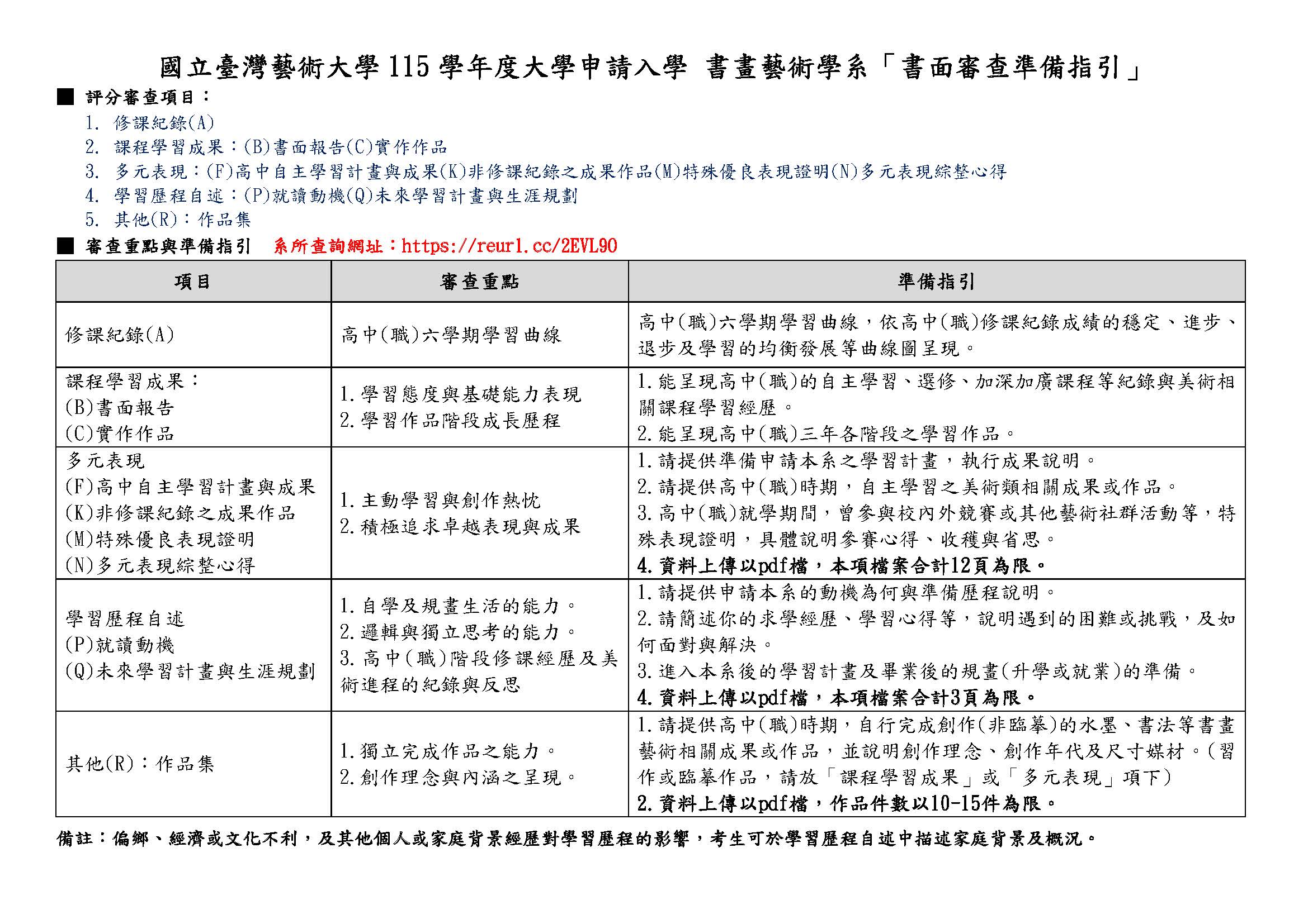 115學年度書畫藝術學系大學申請入學「書面審查準備指引」