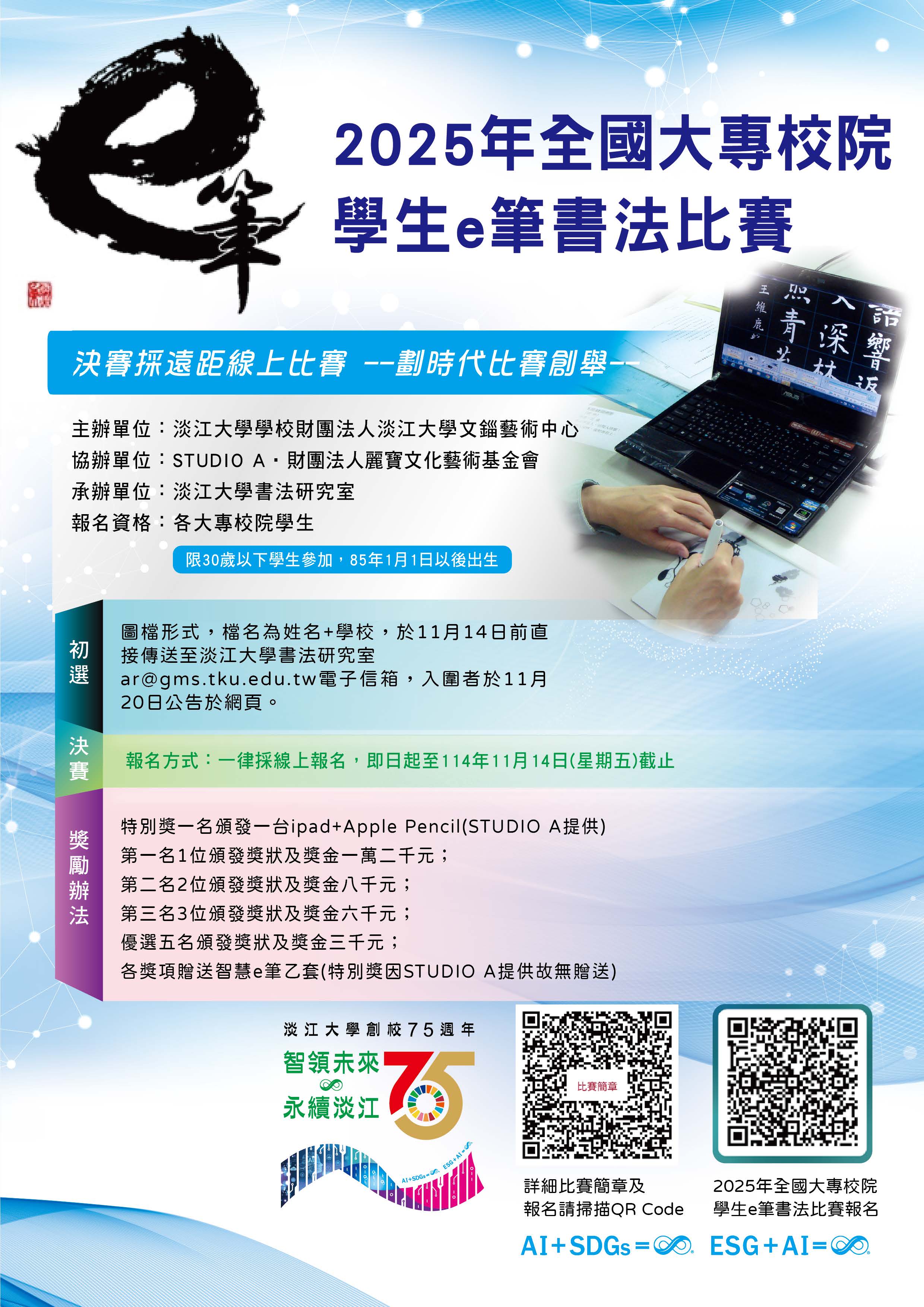 一、比賽主旨:e筆為淡江大學研發之現代科技書畫工具,在校務發展願景AI+SDGs=∞下,積極推動數位轉型,並與AI結合,轉型為智慧e筆。為使全國大專校院同學得以認識熟悉e筆之功能,並做為書寫的工具,特舉辦本項比賽。