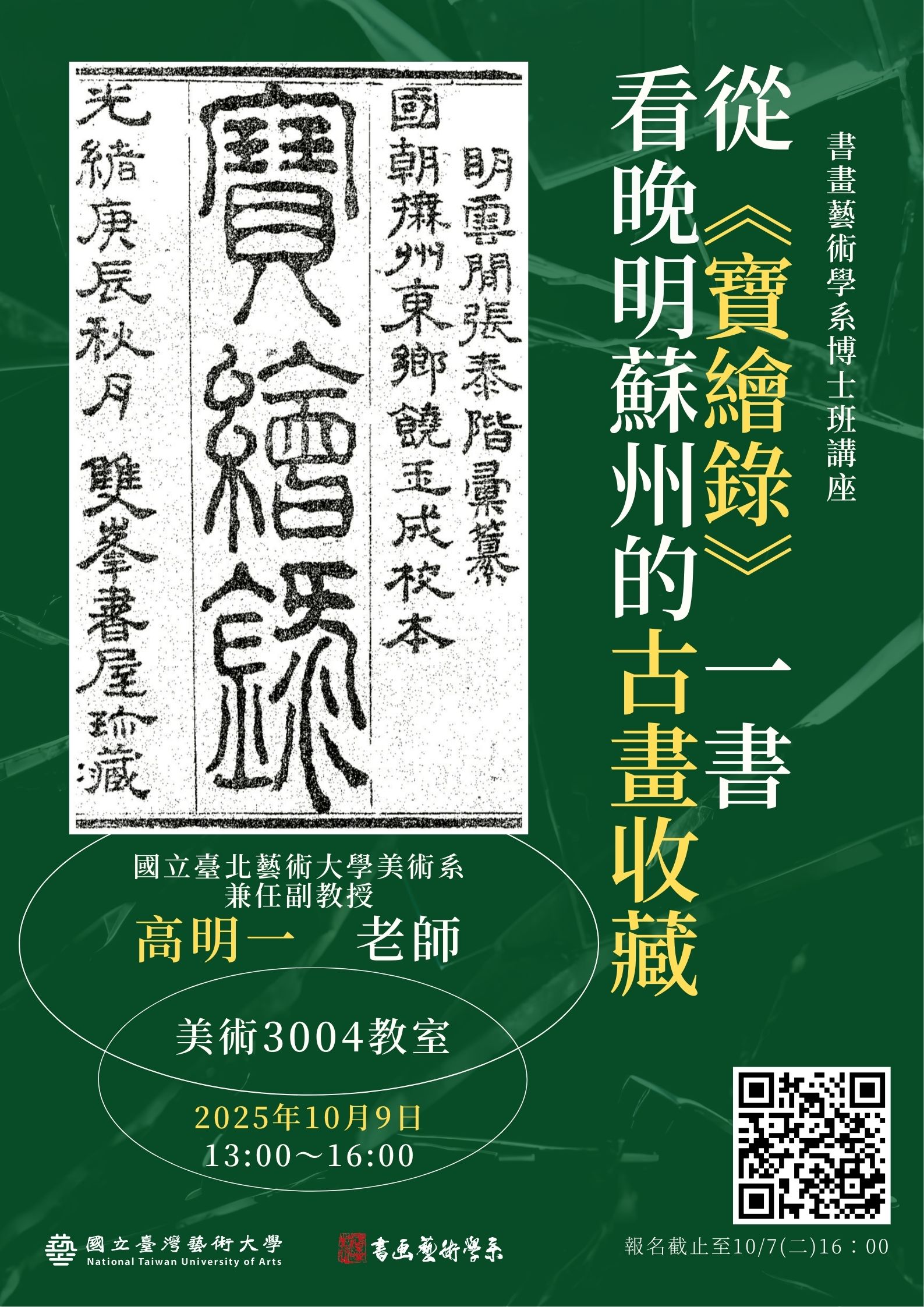 從《寶繪錄》一書看晚明蘇州的古畫收藏講師: 國立臺北藝術大學美術系 高明一 副教授時間:10/9(四)下午13:00~16:00對象:不限地點:3004教室報名時間:即日起至10/7(二)下午16:00截止