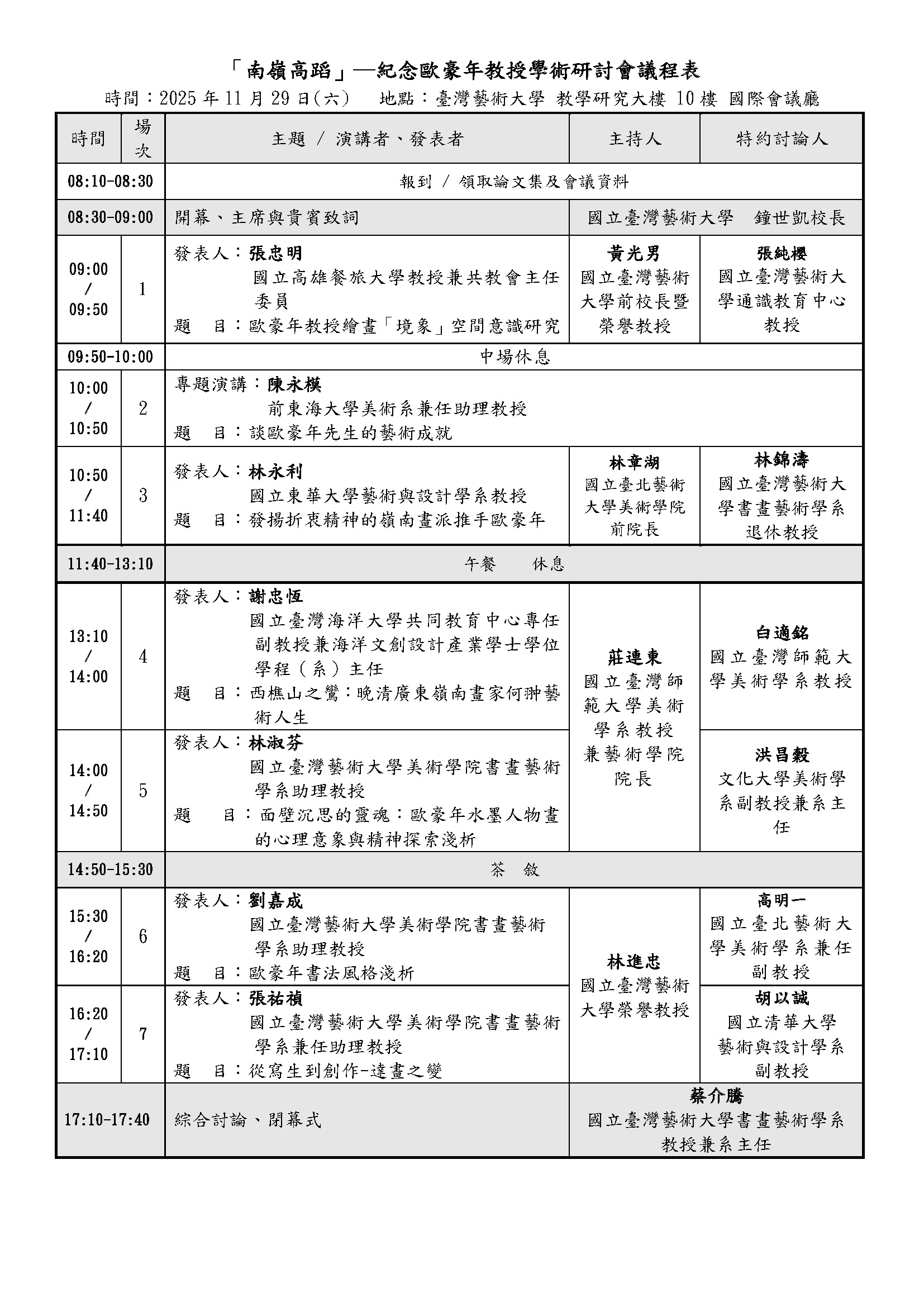 1. 「藝術千秋事,薪火古今傳」書畫藝術創作與學術探討,一直是國立臺灣藝術大學美術學院書畫藝術學系積極努力的目標,回顧本系2019年舉辦「應目會心現代書畫藝術發展」;2022年「創與論-現代書畫藝術」探討書畫創作實踐與應用之內涵析論;2024年又與傅狷夫書畫學系攜手合辦,以「悟對通神」為議題,探討書畫創作者在藝術實踐中,展現其物我合一的境界與創作面貌。從書畫藝術學系透過學術研究積極引動下,對於前輩書畫藝術家的深入探討,經由創作論述與當代發展皆有頗為精闢的分析,在當代書畫藝壇掀起一股討論與風潮。今年本系再聯合擎天藝術群籌辦「南嶺高蹈-紀念歐豪年教授學術研討會」,希望透過此次學術研討會探討相關書畫藝術之開展,也緬懷本校榮譽博士歐豪年一生對藝術的貢獻。同時,希望在藝術精神傳承與當代創新的理想境域有更深刻的討論與理解,作為此次學術研討會探討的目的與宗旨。