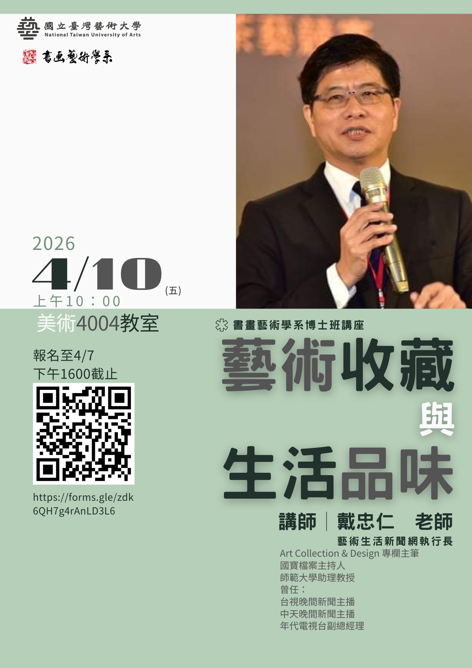 講師: 藝術生活新聞網執行長 戴忠仁 老師時間:04/10(五)上午10:00~11:30對象:不限地點:4007教室報名時間:即日起至04/07(二)下午16:00截止