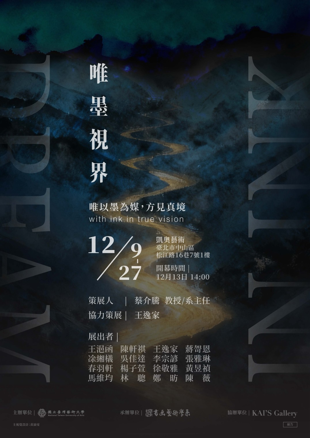 此次展出以,臺灣藝術大學書畫系的學習脈絡,由蔡介騰教授/系主任所策展,邀集在學碩士班研究生參展。以書與畫為主軸,在水墨的流動、書法的線性節奏、膠與彩的光影之間,逐步形成獨特的藝術語彙。