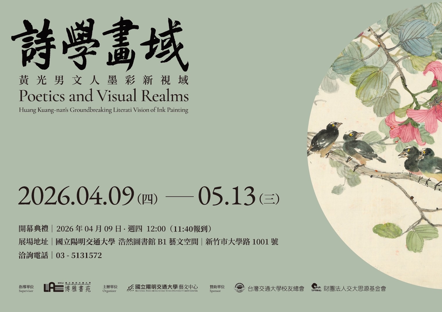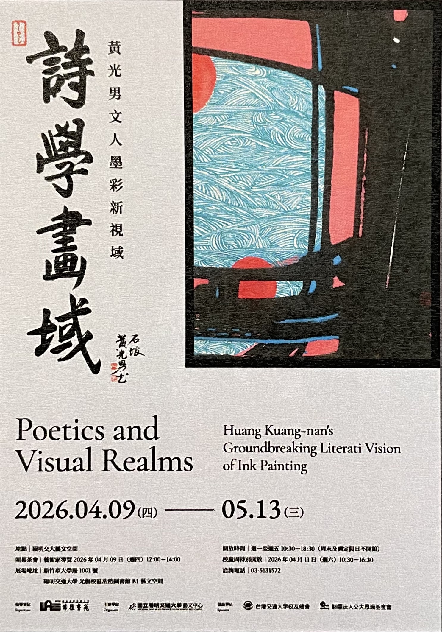 國立陽明交通大學藝文中心將於2026年4月9日至5月13日舉辦「詩學畫域—黃光男文人墨彩新視域」展覽,邀請觀眾走進藝術家黃光男融合詩學與水墨的創作世界。本展聚焦其多年來在新世代墨彩領域的探索成果,呈現其立基東方美學與文學底蘊,開展當代視覺語彙的嶄新面貌。